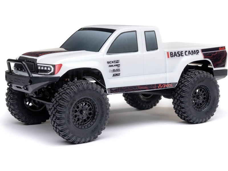 Dostupný malý RC model auta Axial SCX24 Base Camp v mierke 1:24. Ide o ideálny model pre začiatočníkov, ktorý má všetky potrebné funkcie. Obsahuje jednosmerný motor Dynamite 88T s prevodovkou, kvalitný regulátor Spektrum a výkonné servo pre presné proporcionálne ovládanie. Súčasťou balenia je všetko potrebné - RC súprava 2,4 GHz, 7,4 V 350 mAh LiPo akumulátor a USB nabíjačka. Doba jazdy je až 40 min.