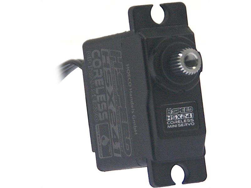 Digitálne servo H-Speed HSX241 pre RC modely áut 1:16-1:24, krútiaci moment 4,6-6kg.cm @ 6-8,4V, rýchlosť 0,115-0,085s/60°. 2x guličkové ložisko, titánové prevody, bezjadrový motor, vodotesné (IP67), napájanie 4,8-8,4V, hmotnosť 22g, rozmery: 29,5x14x29mm. 25T milisekúnd.