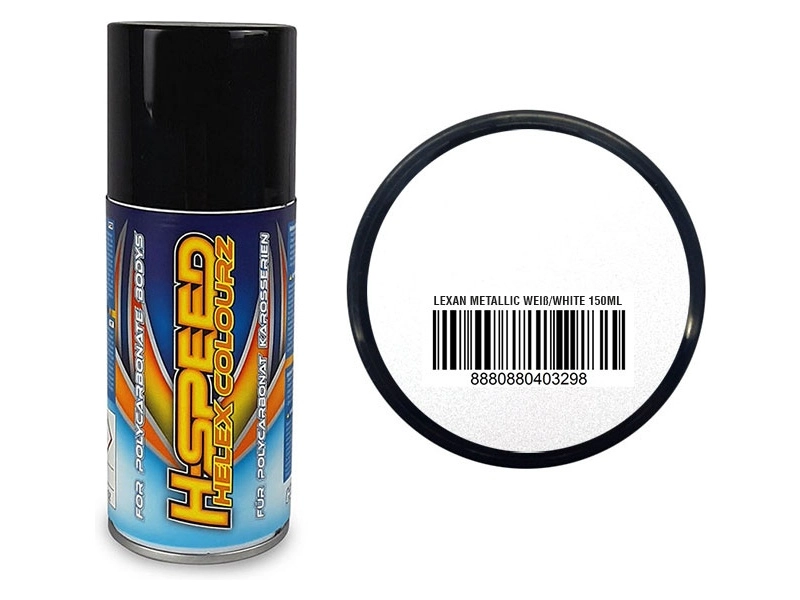 Akrylová farba v spreji H-Speed metallic white je vhodná na širokú škálu materiálov vrátane lexanových karosérií. Výhodou je krátky čas schnutia, vynikajúce krytie a odolnosť proti poškriabaniu. Obsah 150 ml.