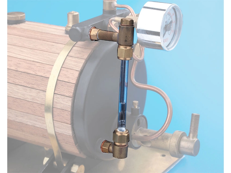 Krick Ukazovateľ hladiny je nevyhnutnou súčasťou každého parného stroja, príslušenstvo kotla ukazuje aktuálnu hladinu vody v kotle parného stroja. Ukazovateľ hladiny vody so závitom M5 x 0,5. Kompletný s 45 mm sklenenou 6 mm trubicou a celým kovovým príslušenstvom.