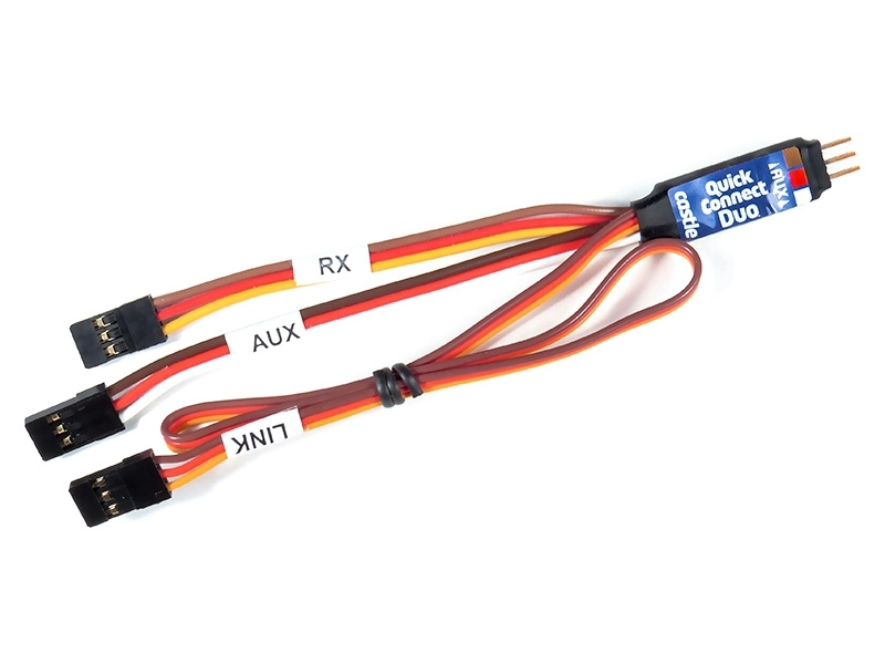Prístroj Castle Quick Connect Duo sa pripája medzi ovládač Castle a prijímač a umožňuje jednoduché programovanie s programátormi Castle. Nebude potrebné zložito vyberať konektor ovládača z prijímača, stačí zapojiť programátor do voľného lead-out konektora.