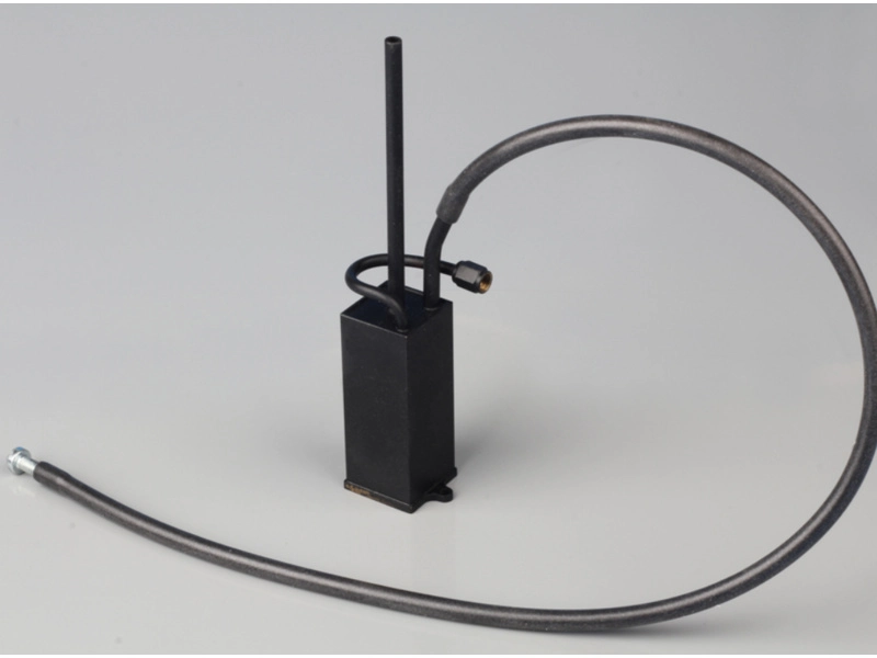 Kondenzátor má dlhší vývod ako komín, z ktorého uniká suchá para. Druhý kratší vývod je stúpacie potrubie, ku ktorému je pripojená vypúšťacia hadica, ktorá sa počas prevádzky stroja uzatvára. Na vypúšťanie sa vypúšťacia hadica otvorí a zasunie do odpadovej nádoby a počas prevádzky sa komín v hornej časti uzavrie, takže odpadová para vytláča odpadový kondenzát. Rozmery: 20 x 20 x 50 mm Odlučovač oleja a vody sa dodáva ako súprava. Mosadzné časti sa musia spájkovať.