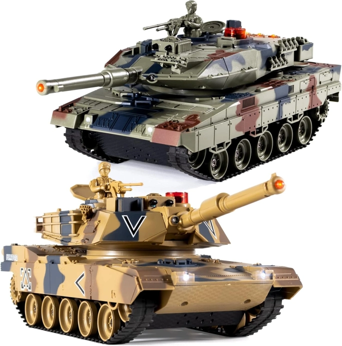 Táto súprava diaľkovo ovládaných RC tankov v mierke 1:24 prináša vzrušujúce bitky s realistickými efektmi a plnou výbavou - ideálna pre fanúšikov vojenských modelov, deti a dospelých, ktorí hľadajú zábavu, adrenalín a dynamickú akciu. Súprava obsahuje dva detailne prepracované tanky - americký M1A2 Abrams a nemecký Leopard 2 - ktoré zvládajú psie súboje, jazdu všetkými smermi, realistické otáčanie veže a infračervenú streľbu s detekciou zásahu.