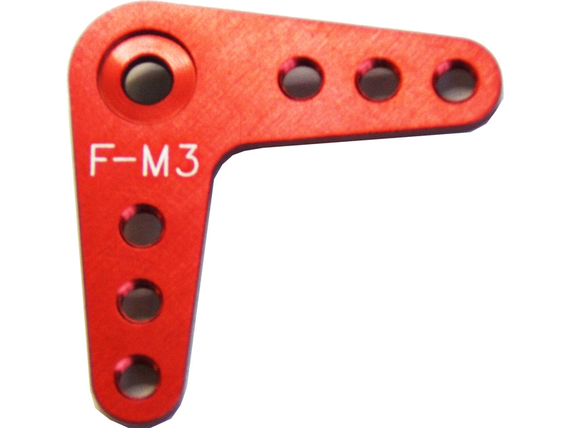 Futaba hliníková L páka pre servá. Celková dĺžka ramena 28 mm, osová vzdialenosť otvorov M3 od stredu tisíchranu páky 10, 15 a 20 mm.