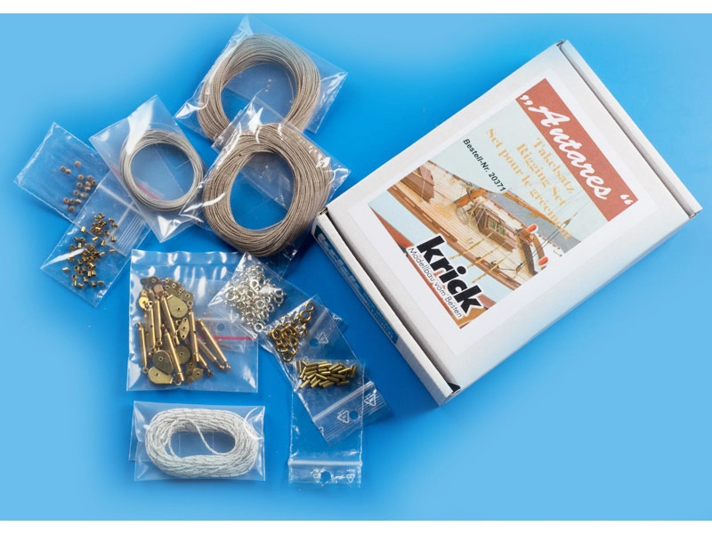 Príslušenstvo Krick Antares. Súprava obsahuje všetky diely na takeláž stožiara, ako sú mosadzné bloky, napínače, laná z nehrdzavejúcej ocele atď.