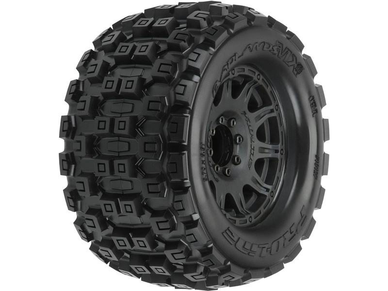 Kompletné kolesá Pro-Line pre RC modely áut 1:8. Rozmery ⌀176x94 mm. Disk s nájazdovými lúčmi je čiernej farby. Pneumatiky Badlands MX28 3,8" MT, tvrdosť zmesi M2 - stredná. Šesťhran 17 mm (vymeniteľný adaptér).