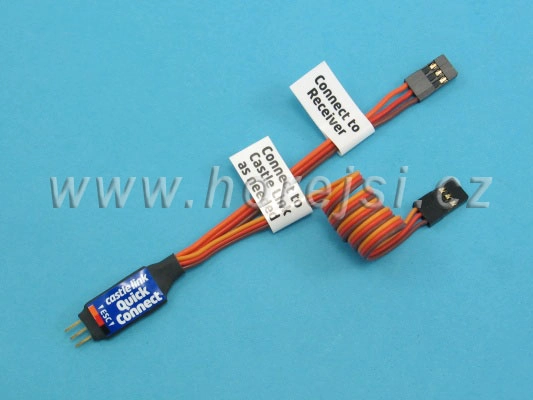 Pripojenýí. Pripojenie je zaistené poistkou s ťažkým kolíkom.Zapojte konektor označený "Connect to Reciever" do přijímače, nainštalujte konektor označený "Connect to Castle Link as needed" do modelu na dostupnom émístole.