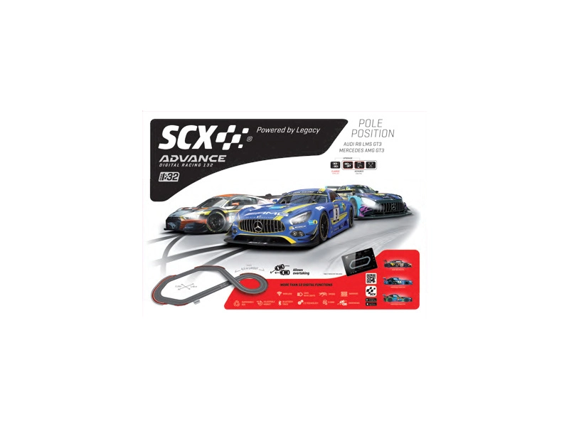 SCX Advance Pole Position 2.0 v klasickej mierke 1:32 - vynikajúca digitálna elektrická pretekárska dráha s predbiehaním v križovatke, Bluetooth rovinkou, mostom, zvodidlami a bariérami. Tri bezdrôtové ovládače s prepínačom, tri digitálne autodráhy s LED svetlami. Plocha rozloženia: 252 x 180 cm. Dĺžka trate: 7,22 m.