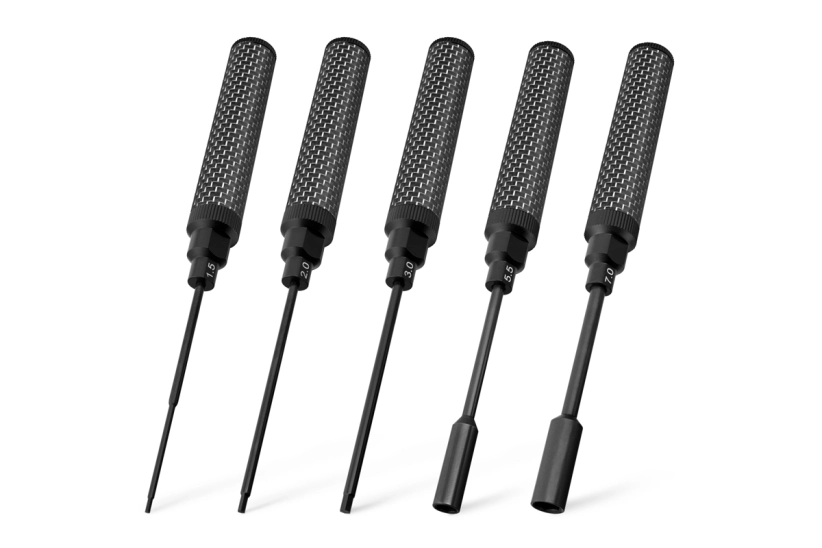 Sada obsahuje čierne skrutkovače s karbónovou rukoväťou s veľkosťou 1,5, 2,0, 3,0 mm šesťhran (imbus) a 5,5, 7,0 mm matica (nástrčka).